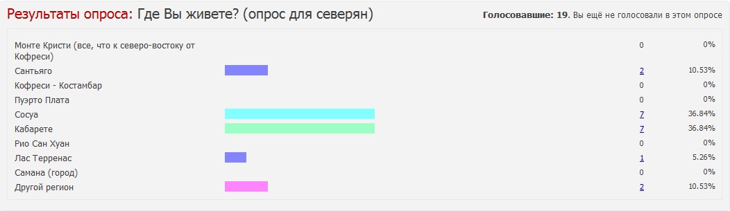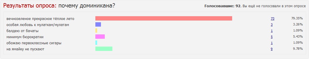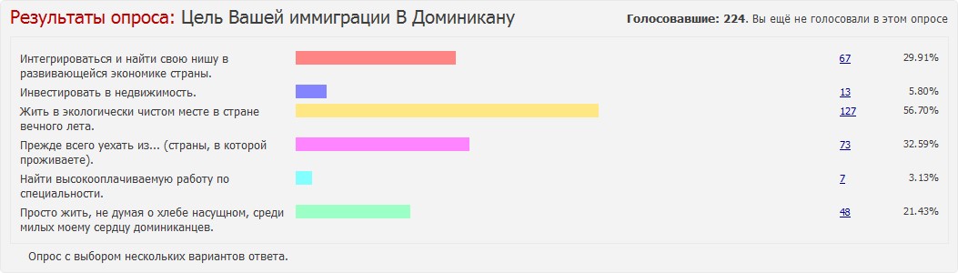 В сети есть сайты и блоги русских, проживающих в Доминикане и пишущих о стране, а есть также и русский форум, на котором русскоязычное население острова пытается общаться и, пользуясь анонимностью, выкладывает данные о своей жизни. Я попробовал сделать выборку опросов с форума, которая, возможно, будет многим интересна. Нельзя сказать, что она достаточно полно отражает действительность ( есть немалое количество людей, включая и меня, которые, хоть и проживают в стране, но не присутствуют на форумах), но и имеющаяся информация позволяет увидеть, как живёт и чем дышит русскоязычное сообщество.